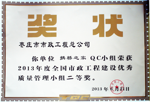“拱橋之家”QC小組榮獲2013年度全國市政工程建設優秀質量管理小組二等獎